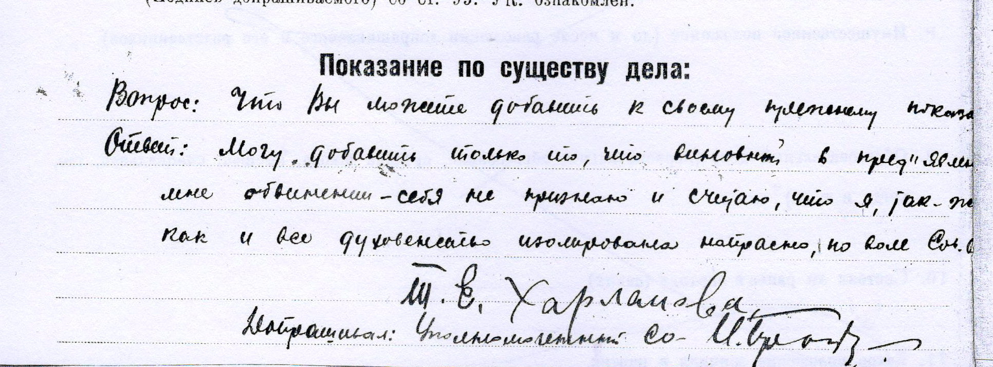 На вопрос следователя: «Что вы можете добавить к своему прежнему показанию?» она ответила: «Могу добавить только то, что виновной в предъявленном мне обвинении себя не признаю и считаю, что я, так же как и все духовенство, изолирована напрасно, по воле Сов. власти».
