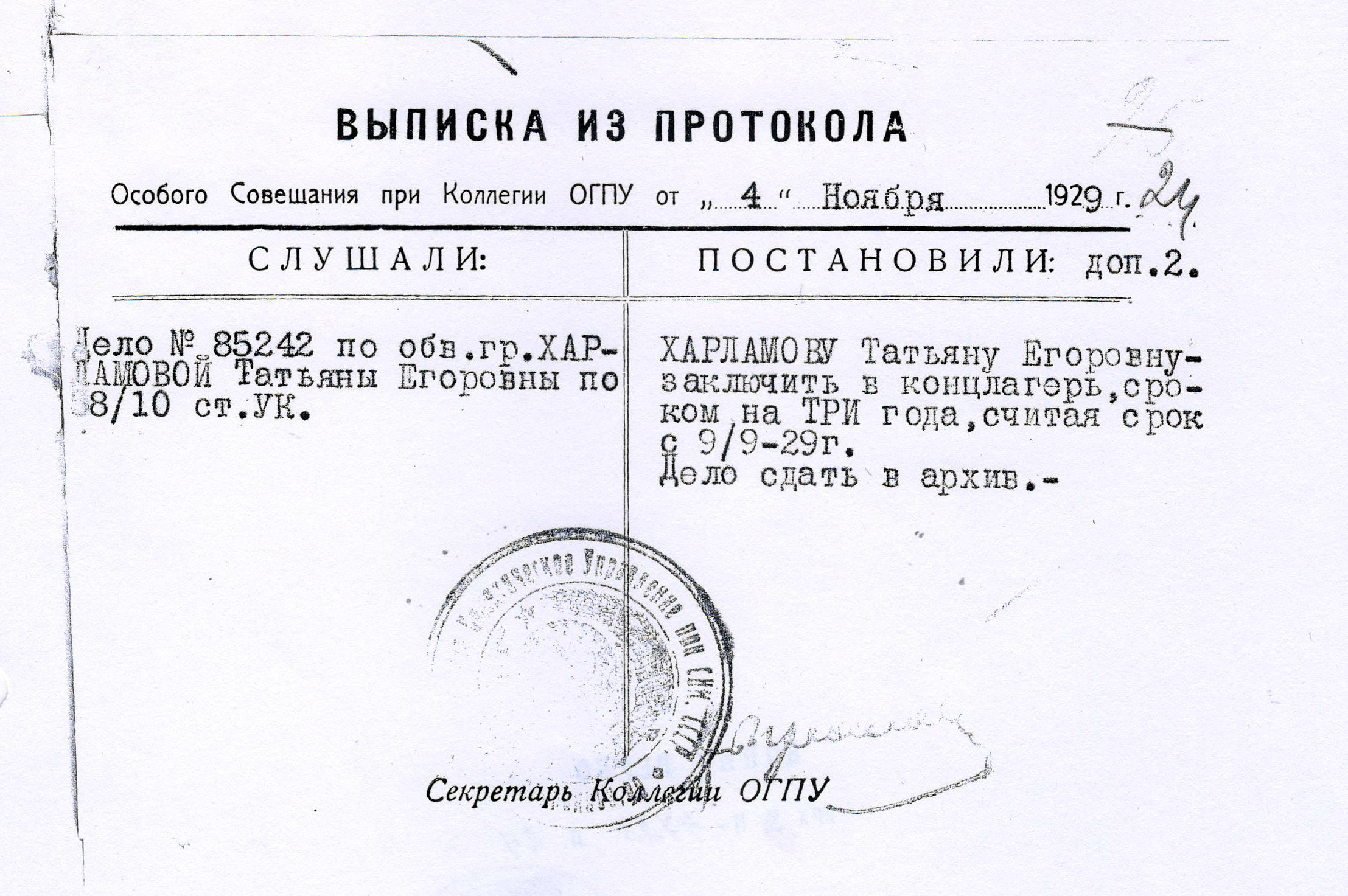 Это статьи бытовые, но Особое Совещание при Коллегии ОГПУ переквалифицировало дело по статье 58/10 и решением от 4 ноября 1929 года приговорило Татьяну к заключению в концлагерь сроком на три года, считая срок с 9 сентября 1929 года. (Справка о реабилитации дана в 1991 году.)